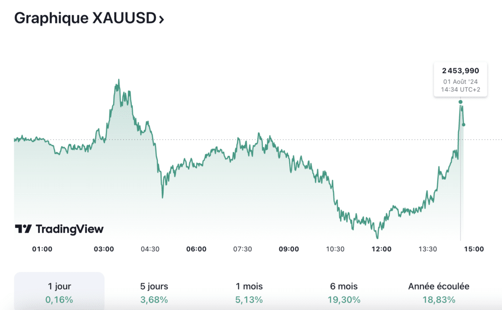 01/08 Le cours de l’or aujourd’hui à son apogée sur les 2 dernières semaines ! Aujourd’hui, l’or continue de démontrer sa résilience et son attrait en tant que valeur refuge. Les récents mouvements à la hausse du cours de l’or, atteignant 2453,99 dollars l’once, sont le reflet d’un ensemble complexe de facteurs économiques et géopolitiques. Les décisions de politique monétaire de la Réserve fédérale et d’autres grandes banques centrales, ainsi que les tensions géopolitiques, jouent un rôle cruciale. Nos experts Abacor décryptent pour vous !