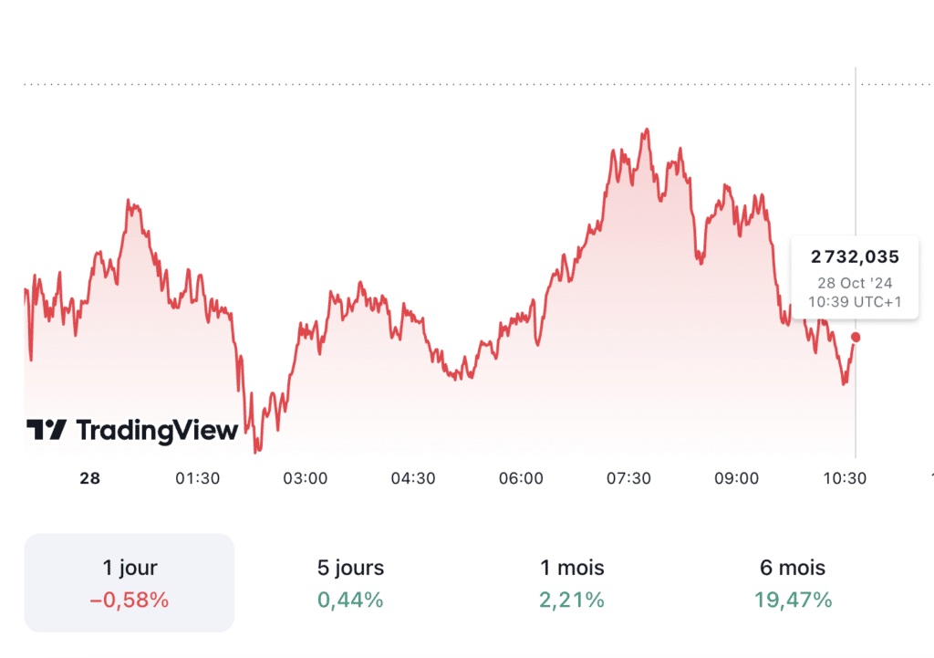 Prévision du cours de l’or aujourd’hui 21/10 : Le cours de l’or (XAU/USD), considéré comme une valeur refuge, atteint des sommets records, s’élevant à 2 733,05 dollars l’once le 21 octobre à 10h28. Ainsi, l’or se positionne une fois de plus comme un refuge incontournable dans un contexte économique et politique marqué par des incertitudes croissantes. Le métal précieux continue de jouer un rôle clé, soutenu par des décisions stratégiques des banques centrales, la dynamique économique mondiale, et des tensions géopolitiques.