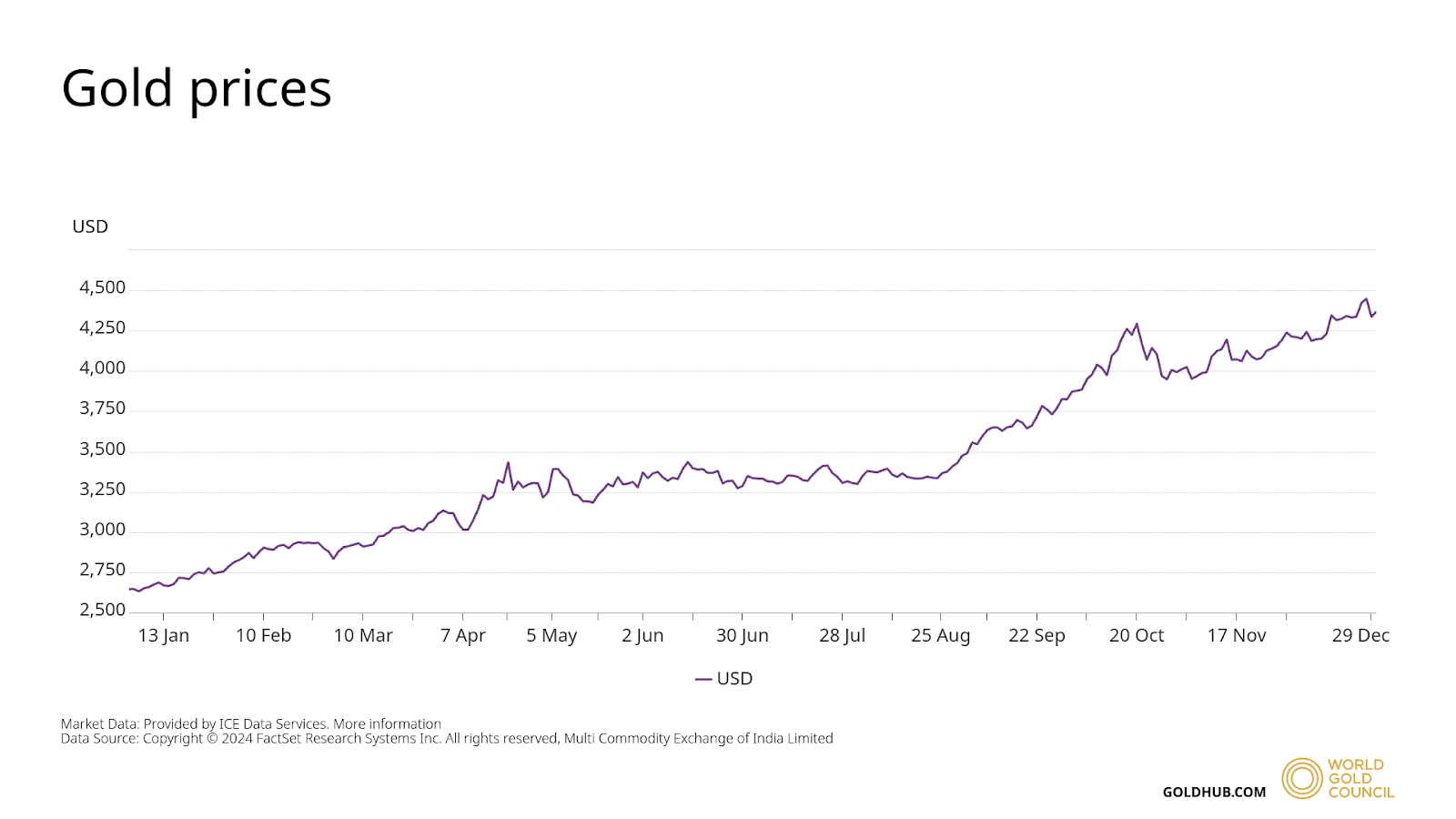 Cette montée en puissance progressive conduit l’once d’or à franchir successivement de nouveaux seuils symboliques. Après avoir effacé la barre des 4 000 dollars le 7 octobre, le métal jaune accélère brutalement avant Noël, brisant le plafond de verre des 4 500 dollars dès le 23 décembre. Cette course folle l’amène à inscrire un sommet absolu en clôture de marché le 26 décembre 2025 à 4 552,70 dollars.