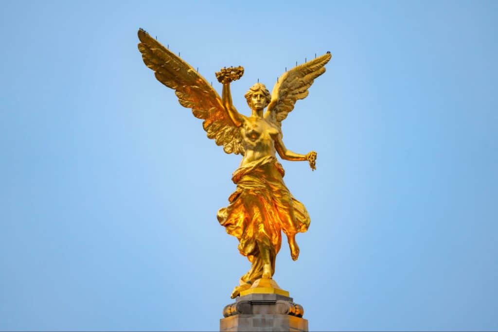 À l’avers de la pièce figure la victoire ailée, inspirée de la mythologie gréco-romaine et au Mexique, on l’associe immédiatement à la statue de l’ange de l’indépendance, un symbole fort et un monument incontournable de la capitale, situé sur l’avenue Paseo de La Reforma. Elle tient dans sa main droite une couronne de laurier, symbole de victoire et une chaîne brisée dans sa main gauche qui évoque la fin de la domination espagnole. En arrière-plan, les volcans Popocatépetl et Iztaccíhuatl, qui comptent parmi les sommets les plus emblématiques du Mexique et occupent une place centrale dans la culture et la mémoire collective. Les mentions 50 Pesos et 37.5 Gr. Oro Puro sont gravées de part et d’autre de l’ange, afin d’indiquer la valeur faciale et le poids d’or fin de la pièce. Deux dates très importantes de l’histoire mexicaine sont également gravées, l’année de l’indépendance du Mexique en 1821 et l’année du millésime de la pièce qui varie entre 1921 et 1947.