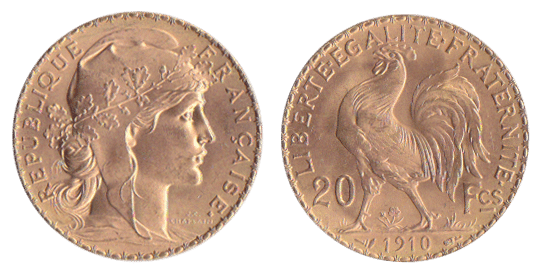 Napoléon Bonaparte fait frapper ses pièces d’or d’abord en tant que Premier Consul avec la 20 francs profil lauré Bonaparte Premier Consul  entre 1803 et 1804, puis comme Empereur avec l’effigie Napoléon Empereur de 1804 à 1814. Après la chute de Napoléon Ier, les rois de la restauration, Louis XVIII et Charles X, ainsi que le roi Louis-Philippe Ier sous la monarchie de Juillet, continuent tous d’émettre des pièces de 20 francs or à leur effigie​.  Bien que le souverain change, le nom de Napoléon reste communément utilisé pour désigner ces pièces de 20 francs, en raison de leur format inchangé hérité de l’Empereur​. La Deuxième République frappée entre 1848 et 1852 choisit de représenter sur la pièce de 20 francs non pas un président, mais une effigie allégorique, ce sera la tête de Cérès, déesse de l’Agriculture, sur les émissions de 1849 à 1851. Puis Napoléon III, devenu Empereur en 1852, fait frapper de nombreuses pièces de 20 francs à son effigie entre 1852 et 1870, d’abord  avec l’effigie la tête nue, puis la tête laurée à partir de 1861. Après la chute du Second Empire, la Troisième République continue la tradition et dès 1871 un type de 20F au Génie ailé est réintroduit avec pour effigie un ange écrivant la Constitution, accompagné d’une devise « Liberté Égalité Fraternité », remplaçant l’ancienne mention « Dieu protège la France » qui figurait sous l’Empire. Enfin, en 1899, la Monnaie de Paris lance le dernier avatar du 20 francs or, la pièce Marianne Coq qui porte sur son avers la tête de Marianne coiffée du bonnet phrygien et au revers un coq gaulois. Plus de 117 millions de ces pièces Marianne Coq seront émises de 1899 à 1914​, jusqu’à la Première Guerre mondiale qui mettra fin définitivement à l’usage des pièces en or en tant que monnaie en France.