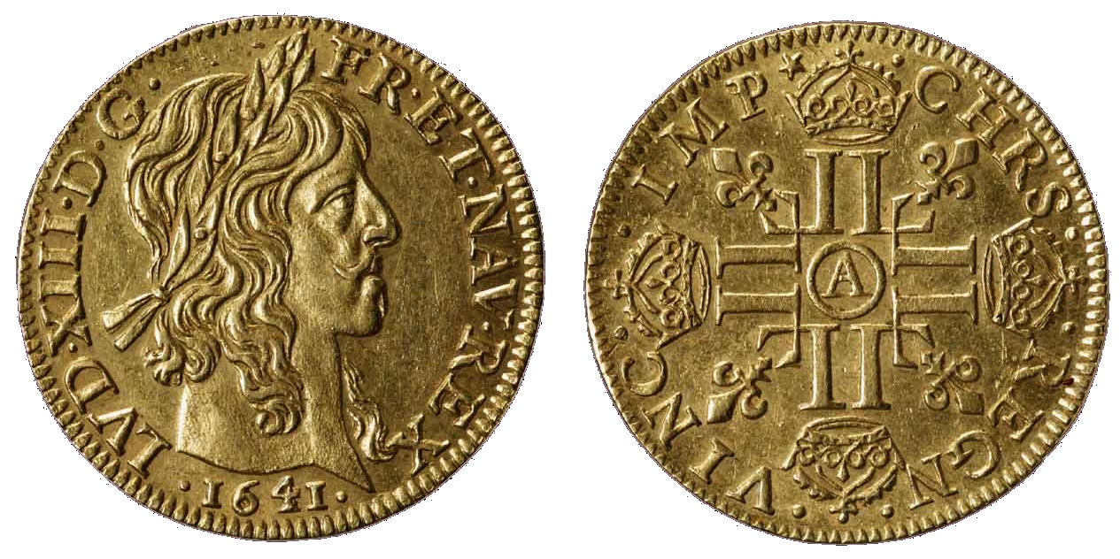 En 1641, un Louis d’or frappé sous Louis XIII, présentait sur son avers le buste lauré du roi et sur son revers une croix formée de quatre L couronnés, séparés par des fleurs de lys​. Ce motif de croix au monogramme royal est inspiré des pistoles espagnoles et deviendra caractéristique des louis d’or. La légende latine du revers, « CHRS REGN VINC IMP » pour Christus regnat, vincit, imperat, reflète la devise sacrale de la monarchie française.​