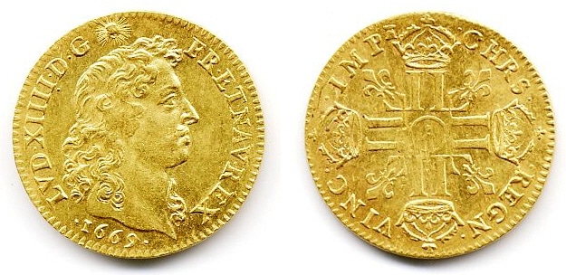 Cette dernière pièce, pesant près de 67,5 g d’or fut fabriquée en très petit nombre à des fins honorifiques et devint la plus grande monnaie d’or jamais frappée en France​. Les louis d’or standards ne portent pas de valeur faciale sur la pièce et arborent sur une face le portrait du roi de France en buste lauré à l’antique et sur l’autre face un motif représentant le monogramme royal avec plusieurs L entrelacés sous des couronnes. Ces caractéristiques iconographiques, définies par le graveur général Jean Warin, resteront en grande partie celles des louis d’or tout au long de l’Ancien Régime​.