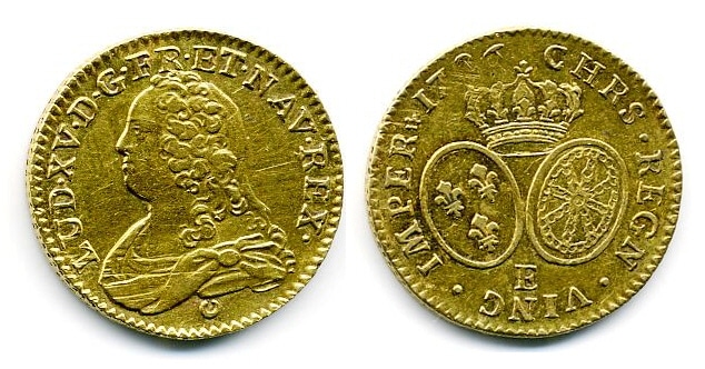 Les décennies suivantes voient de légères fluctuations du poids et de la teneur en or, au gré des besoins du Trésor, mais sans bouleversement majeur. Sous Louis XV, on distingue divers types de louis d’or par leur iconographie, le louis d’or dit aux lunettes de 1726, avec un buste du roi à tête nue et des boucles de cheveux en lunettes, le louis au bandeau après 1740, présentant le roi avec un bandeau dans les cheveux, etc. Chacun de ces types correspond à de subtiles évolutions du portrait royal ou des armoiries au revers, sans incidence sur la valeur en or de la pièce. En parallèle, le louis d’or reste décliné en demi, double, quadruple, pour les besoins de l’économie et ces divisions et multiplications conservent des proportions de poids respectant l’étalon du louis simple.