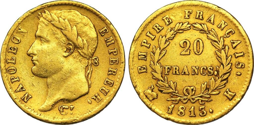 Après une décennie révolutionnaire chaotique sur le plan monétaire, c’est le Premier Consul Napoléon Bonaparte qui rétablit une monnaie d’or stable en France. Par la loi du 7 germinal an XI du 28 mars 1803, il crée le franc germinal​. Cette réforme introduit notamment une pièce d’or de 20 francs qui vient prendre la relève du louis d’or​. Très vite, le public et les institutions adoptent cette pièce de 20 francs or comme nouveau standard. Par un curieux héritage linguistique, on la surnomme familièrement Napoléon, du nom de Napoléon Bonaparte dont le profil figure sur les premières émissions. Ce nom restera d’usage pour désigner toutes les pièces françaises de 20 francs en or au XIXe siècle, y compris sous des régimes postérieurs où Napoléon n’est plus au pouvoir​.