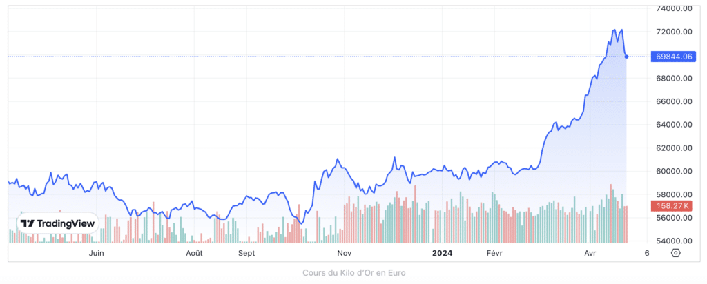 Le prix de l’or, qui avait maintenu des niveaux record pendant plusieurs semaines consécutives, a enregistré une légère baisse le mardi 23 avril 2024. À 19h34 (heure de Paris), le prix de l’or s’est fixé à 2325,40 dollars l’once. Ce qui correspond à 69 816 euros le kilo.