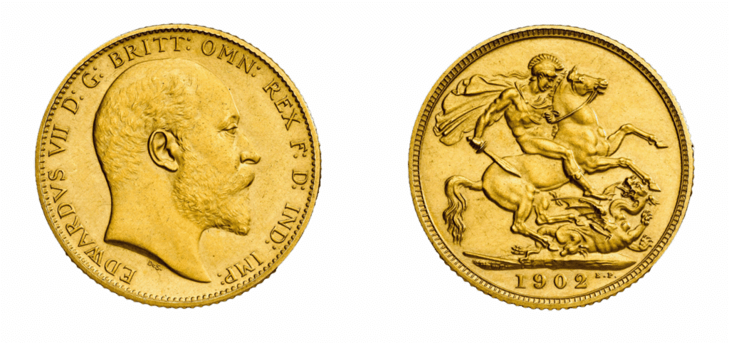 L’inscription évolue pour refléter l’expansion impériale « EDWARDVS VII D G BRITT OMN REX F D IND IMP » soit « Édouard VII, par la Grâce de Dieu, roi de tous les Britanniques, Défenseur de la Foi, Empereur des Indes ». L’ajout du titre « IND IMP » pour « Imperator Indiae » soit en français « Empereur des Indes » souligne l’importance cruciale de l’Inde dans l’Empire britannique. Sous Édouard VII, la production de souverains atteint des sommets, avec un nouvel atelier qui commence sa production en 1908 à Ottawa au Canada avec des pièces marquées d’un « C ».