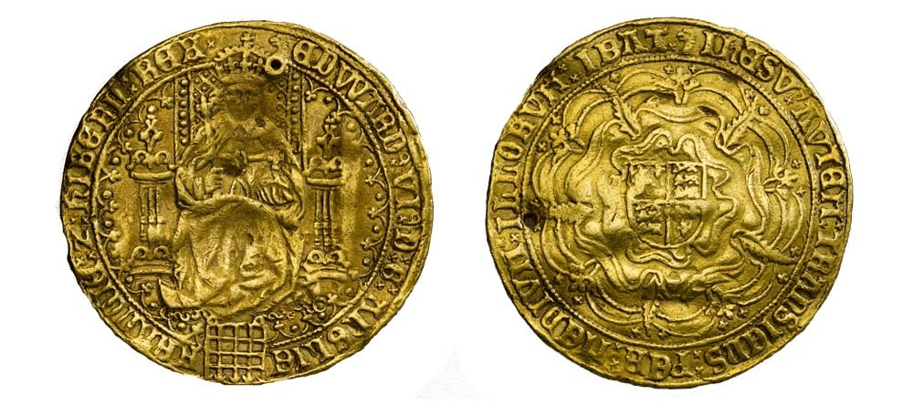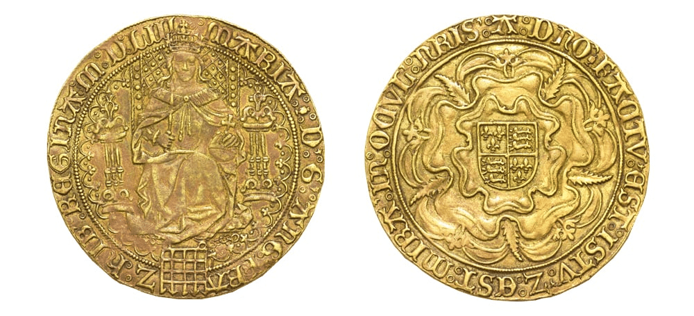 Le revers affiche quant à lui les armoiries royales entourées d’une rose Tudor afin de symboliser la réconciliation entre les maisons de Lancastre et d’York. Le nouveau blason est entouré par la citation évangélique « IHS autem transiens per medium illorum ibat » soit en français Mais Jésus, passant au milieu d’eux, s’en alla, qui est une formule protectrice, conférant à la monnaie une dimension spirituelle. Comme le Christ échappant à la foule hostile de Nazareth après avoir affirmé son statut de prophète dans la synagogue, Henri affirme son autorité et traverse l’hostilité de son époque, non par la force des armes seules, mais par la confiance dans son destin supérieur.