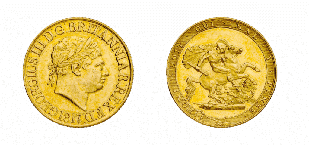 L’année 1817 marque un tournant décisif dans l’histoire du souverain car la Grande-Bretagne, victorieuse des guerres napoléoniennes, mais économiquement affaiblie, entreprend une vaste réforme de son système monétaire appelée la Grande Refonte de 1816. Le gouvernement adopte officiellement l’étalon-or, c’est-à-dire un système où la monnaie est directement convertible en or à un taux fixe et immuable. Dans ce contexte, le souverain réintroduit devient la pièce d’or de référence, avec une valeur faciale d’une livre sterling.