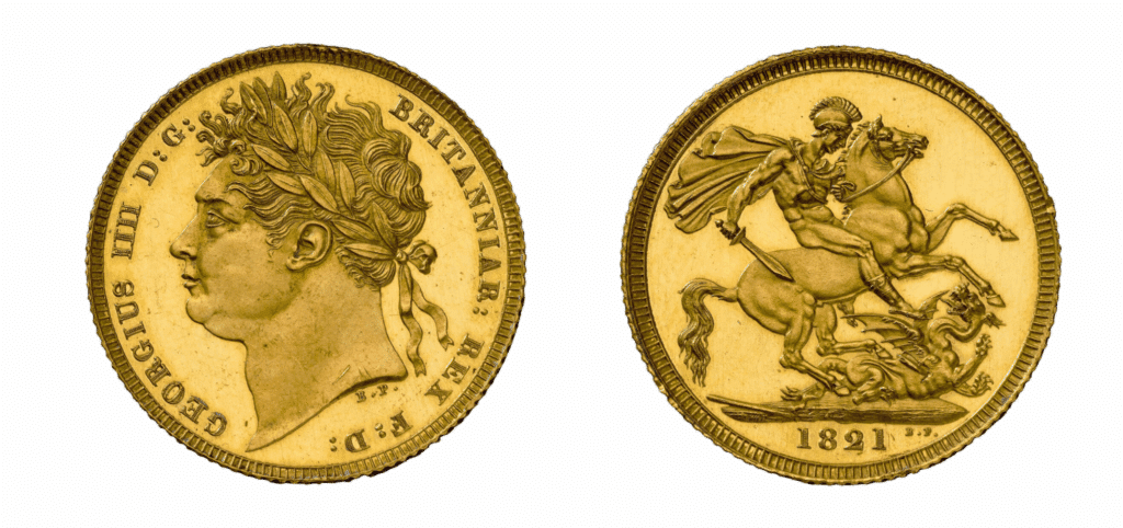 Sous George III, la Royal Mint relance le souverain dans le cadre du nouveau système monétaire de l’étalon-or.