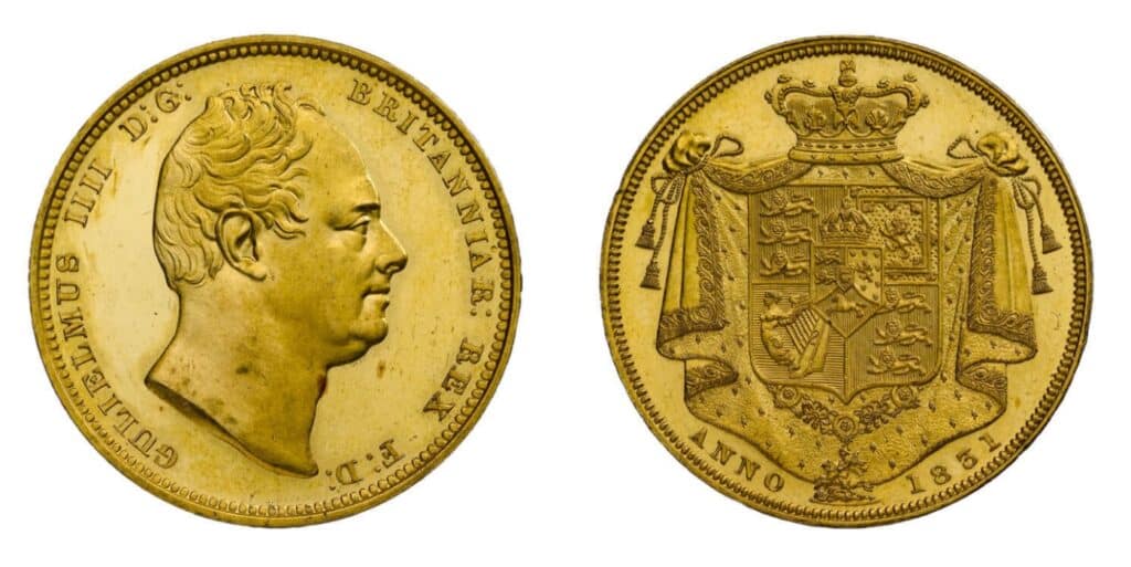 Entre 1831 et 1837, fait rarissime dans l’histoire du souverain, la Royal Mint délaisse la célèbre scène du Saint Georges terrassant le dragon pour lui substituer un écu royal couronné, orné des armes du Royaume-Uni et entouré du collier de l’ordre de la Jarretière. Cette décision s’explique par les tensions persistantes entre Benedetto Pistrucci, auteur du revers originel et la direction de l’institution. En effet, alors que la Royal Mint souhaite introduire un nouveau type monétaire lors de l’accession de Guillaume IV, Pistrucci refuse toute modification de son dessin originel.