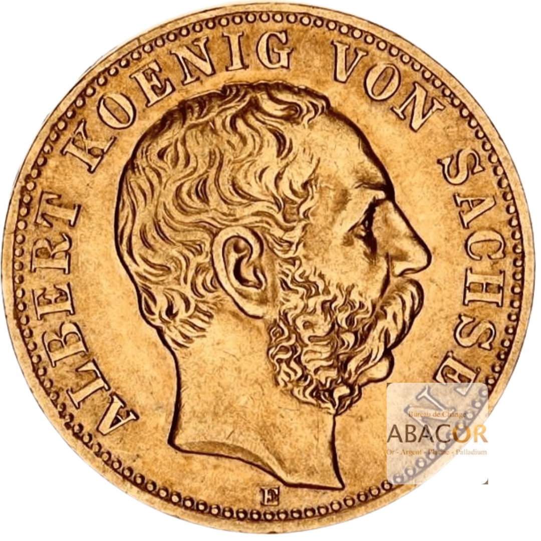 Pièce d’or 10 Mark Or Albert. Abacor, comptoirs experts en numismatique depuis près de 30 ans, vous accompagnent dans l’achat de pièces d’or, alliant investissement sûr et passion pour l’histoire. La pièce de 10 Mark Or Albert de Saxe est un témoin de l’unification monétaire de l’Empire allemand après 1871. Frappée sous le règne du roi Albert de Saxe, elle arbore son portrait à l’avers et l’aigle impérial au revers, symbole de l’unité allemande sous l’autorité de Guillaume Ier. Sa rareté varie selon l’année d’émission, certaines frappes étant très recherchées par les collectionneurs. Elle incarne une période de modernisation économique et de stabilité sous le système monétaire du Reich.