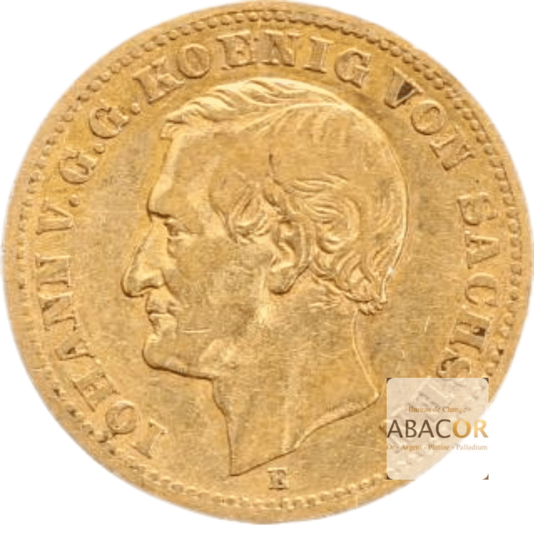 Pièce d’or 10 Mark Or Johann. Abacor, comptoirs experts en numismatique depuis près de 30 ans, vous accompagnent dans l’achat de pièces d’or, alliant investissement sûr et passion pour l’histoire. La pièce de 10 Mark Or Johann des années 1872 et 1873 a été émise par le Royaume de Saxe sous le règne du Roi Jean de Saxe (Johann von Sachsen).