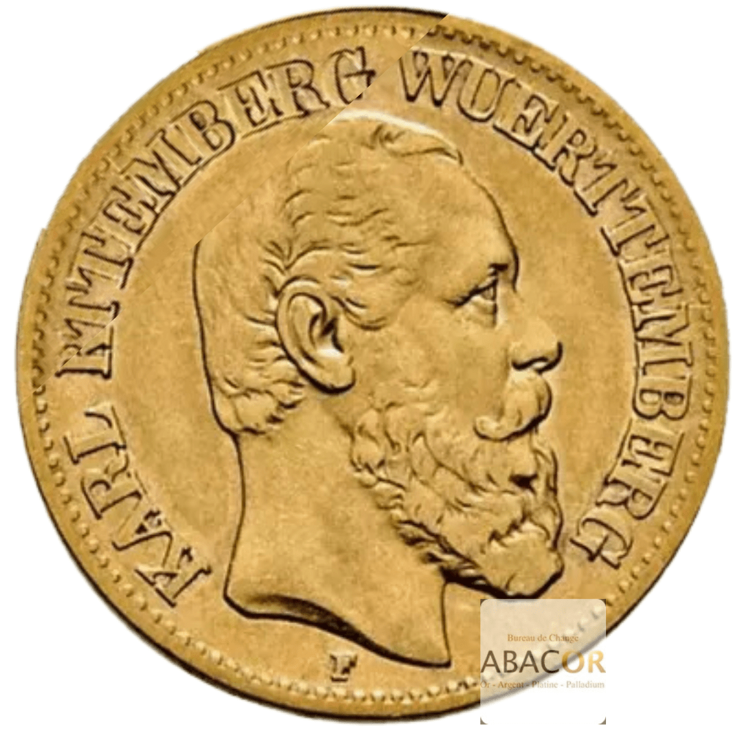 Pièce d’or 10 Mark Or Karl Ier. Abacor, comptoirs experts en numismatique depuis près de 30 ans, vous accompagnent dans l’achat de pièces d’or, alliant investissement sûr et passion pour l’histoire. Le règne de Karl I a marqué une période de stabilité et de développement économique pour le royaume de Wurtemberg. La monnaie de cette époque reflète à la fois la prospérité de la région et la puissance de la famille royale. Les pièces frappées sous son règne, notamment la 10 Mark Or, sont particulièrement prisées par les numismates en raison de leur rareté et de la beauté de leurs frappes.