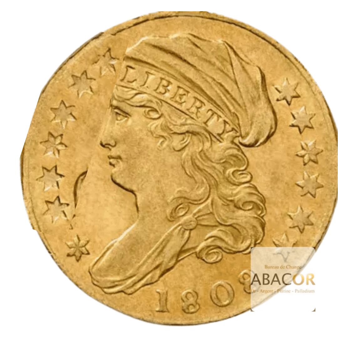 Pièce d’or 2.5 Dollars Tête à Gauche. Abacor, comptoirs experts en numismatique depuis près de 30 ans, vous accompagnent dans l’achat de pièces d’or, alliant investissement sûr et passion pour l’histoire. La pièce de 2.5 Dollars Or Tête à Gauche (1808), également connue sous le nom de Quarter Eagle, est une pièce emblématique de la numismatique américaine, célèbre pour son design unique et sa production extrêmement limitée. Ainsi, en 1808, John Reich conçoit un nouveau design pour la pièce d’or de 2,5 Dollars, s’inspirant du motif « Draped Bust » et de l’aigle héraldique de Robert Scot utilisé sur les pièces de 1796 à 1807.