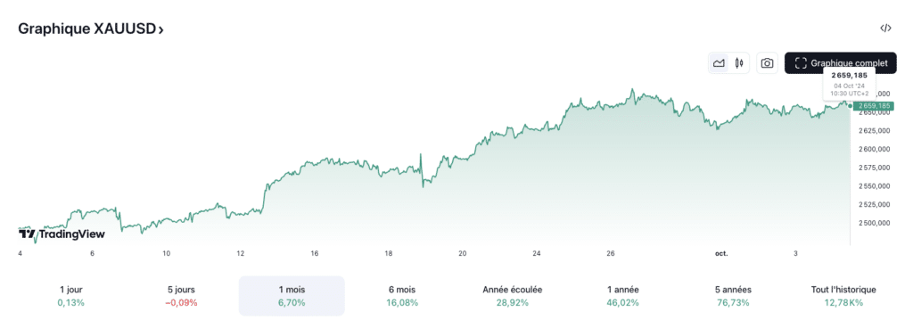 Prévision du cours de l’or 04/10. Aujourd’hui, le cours de l’or (XAU/USD) est en légère augmentation de 0,1 % et s’élève à 2 659,18 dollars l’once à 10h00 UTC+2. En outre, le prix du kilo d’or est estimé à 77 594 euros et le prix du gramme d’or 18 carats à 77,59 euros.