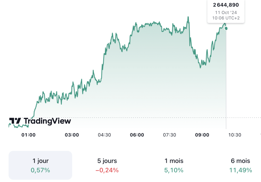 Prévision du cours de l’or aujourd’hui 11/10. Aujourd’hui, le cours de l’or (XAU/USD) est en légère augmentation de 0,57 % et s’élève à 2 644,890 dollars l’once à 10h06 UTC+2. En outre, le prix du kilo d’or est estimé à 77 648 euros et le prix du gramme d’or 18 carats à 77,67 euros.