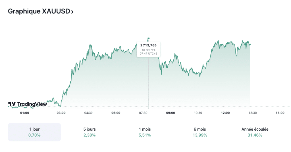 Prévision du cours de l’or 18/10: L’or atteint des sommets records. Le cours de l’or (XAU/USD), considéré comme une valeur refuge, atteint des sommets records, s’élevant à 2 701,80 dollars l’once le 18 octobre à 10h38. Ainsi, l’or se positionne une fois de plus comme un refuge incontournable dans un contexte économique et politique marqué par des incertitudes croissantes. Le métal précieux continue de jouer un rôle clé, soutenu par des décisions stratégiques des banques centrales, la dynamique économique mondiale, et des tensions géopolitiques.