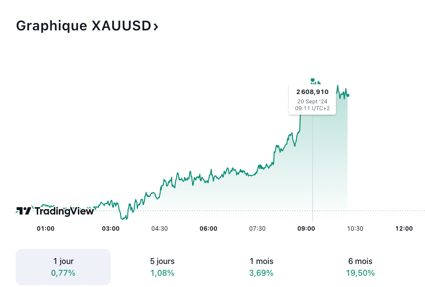 À la question : Quelles sont les prévisions du cours de l’or aujourd’hui ? La réponse est la suivante. Aujourd’hui, le cours de l’or (XAU/USD) s’élève à 2 608,91 dollars l’once et affiche un solide retour haussier suite à la baisse des taux d’intérêt agressive par la Fed, survenue avant-hier.