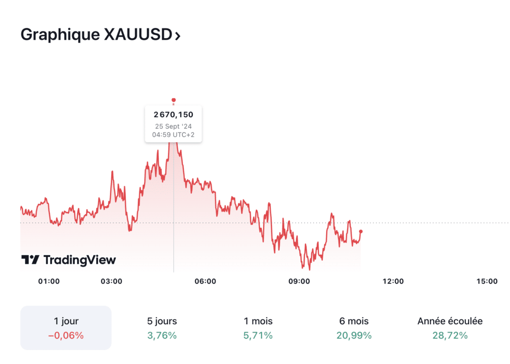 Prévision du cours de l’or aujourd’hui 25/09. Le prix de l’or est actuellement dans une tendance haussière, franchissant pour la première fois le seuil des 2 670,15 dollars l’once aujourd’hui ! En effet, l’or, a franchi un cap historique ce mercredi en atteignant un nouveau sommet à 2 670,15 dollars l’once. Depuis le début de l’année 2024, le métal jaune a vu son prix grimper de plus de 27 %. Il s’agit d’une progression remarquable qui place l’or en bonne voie pour réaliser des performances encore plus spectaculaires à l’avenir. Ainsi, ce mouvement haussier s’explique par un ensemble de facteurs macroéconomiques et géopolitiques qui, ensemble, ont renforcé l’attrait de l’or sur les marchés financiers. Jusqu’où ira le cours de l’or ? Les experts Abacor décryptent pour vous !