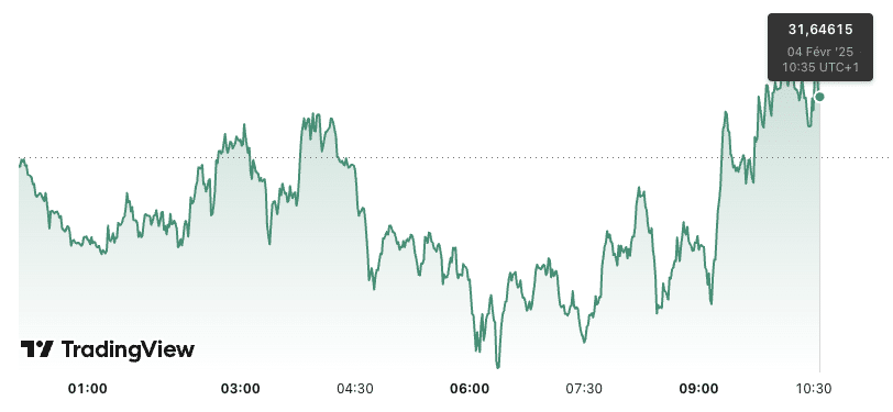 Prévision du cours de l’argent aujourd’hui 04/02. Le cours de l’argent (XAG/USD) s’échange actuellement à 31,64 dollars l’once, avec au plus bas à 31,36 dollars l’once et une résistance à 31,90 dollars l’once. Ainsi, le marché reste incertain. En effet, l’argent subit une pression baissière en raison d’un dollar plus fort. De plus, la récente pause tarifaire entre les États-Unis, le Canada et le Mexique a apaisé les tensions commerciales, ce qui a soutenu le dollar et les rendements obligataires. Toutefois, malgré ces freins, la demande industrielle reste solide, limitant ainsi la baisse du métal.